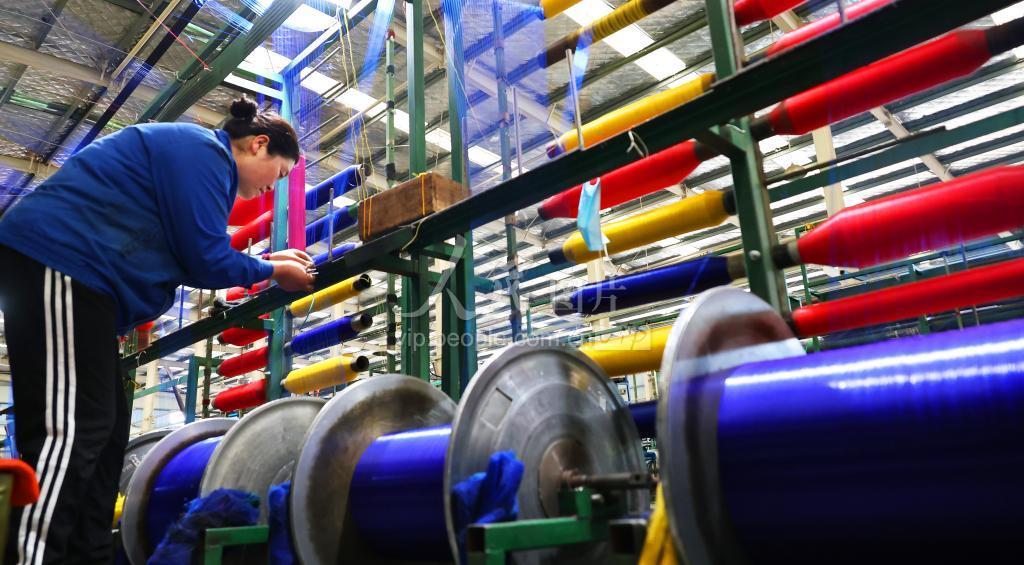 2023年3月30日,连云港高新区海州工业园内一家外贸网具企业经编车间,工人正在生产线上忙碌。