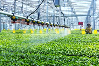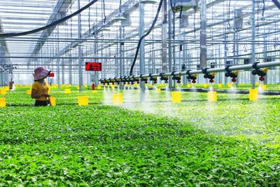 2023年4月11日,河南省商丘市柘城县国家数字农业种植示范基地辣椒育苗中心,农技人员正利用“5G+智能管控系统”为辣椒无土育苗喷撒营养液。近年来,柘城县大力推广普及农业新技术,实现科技服务到田间,农情测报点对点,助推农民增收。