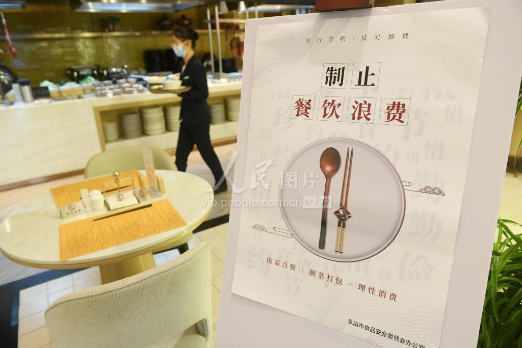 2023年4月15日,安徽省阜阳市颍州区三清路一家餐厅将制止餐饮浪费宣传海报张贴摆放明显位置。