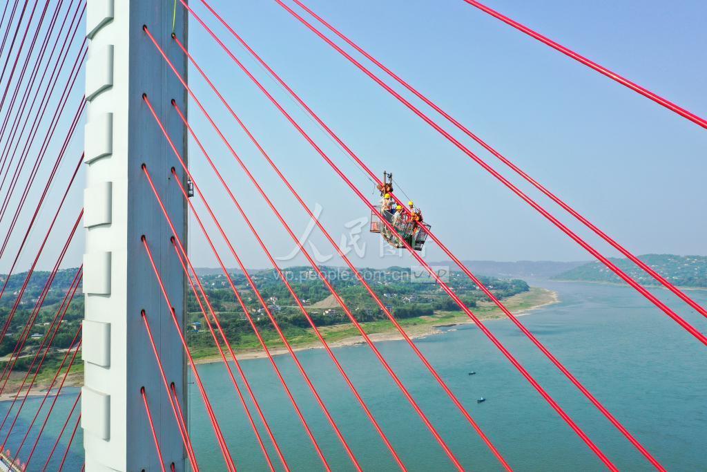 4月27日,四川省泸州市合江县白沙长江大桥进入沥青铺设阶段,工人们在各自岗位上全力冲刺收尾工作。