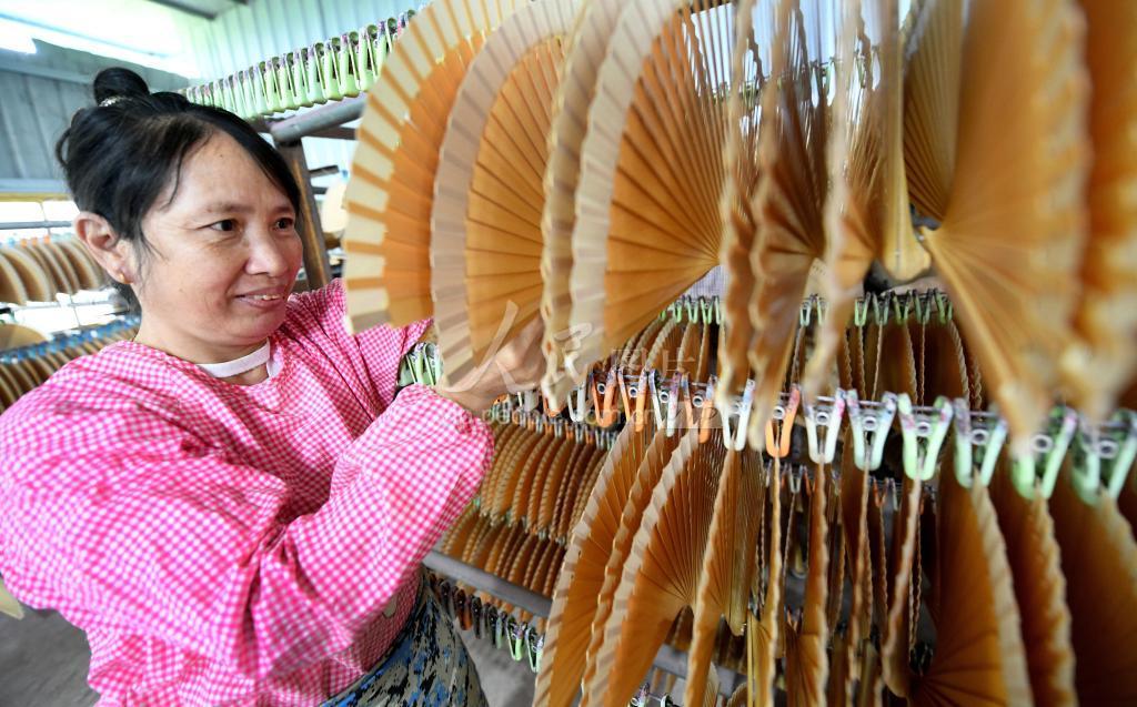 2023年5月3日,江西省抚州市广昌县甘竹镇,工人正在制作出口国外的工艺香扇。