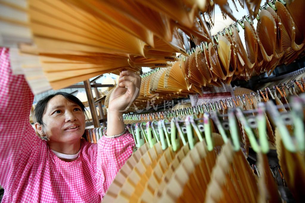2023年5月3日,江西省抚州市广昌县甘竹镇,工人正在制作出口国外的工艺香扇。 据了解,江西省抚州市广昌县甘竹镇有一批从事工艺香扇制作加工的“微企业”、“微作坊”。它们在当地政府积极引导和扶持下,已开发出各种工艺扇、挂历扇、折扇等20多个品种,产品远销日本、新加坡、西班牙等国际市场,还带动当地村民在家门口就业增收。