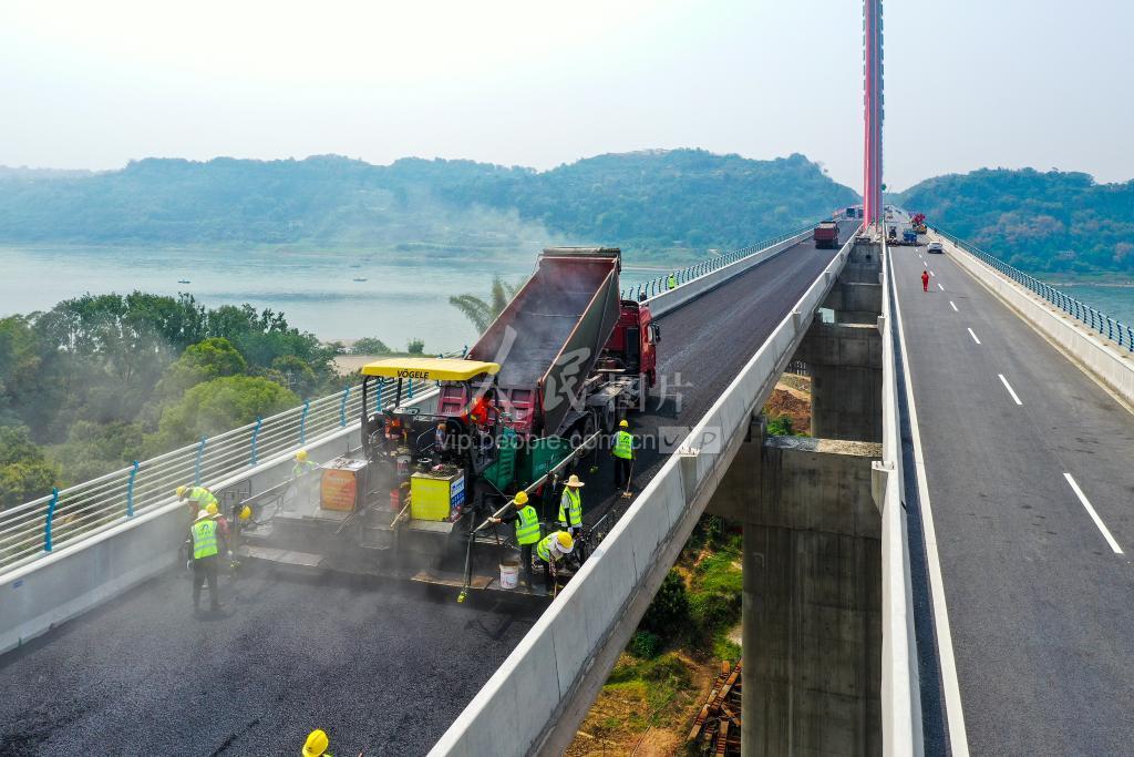 5月4日,工人在四川省泸州市合江县白沙长江大桥上加紧沥青铺设。