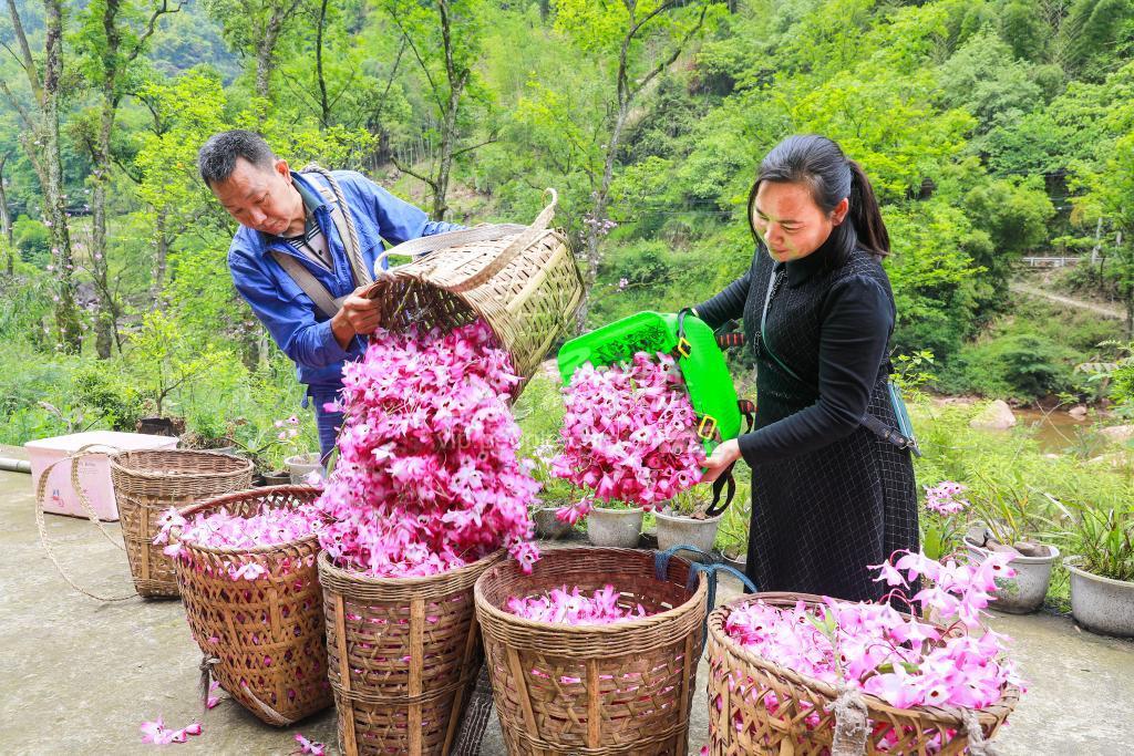 2023年5月12日,合江县福宝镇打撮坝村楒栗坝金钗石斛基地,村民忙着转运采摘的金钗石斛鲜花。