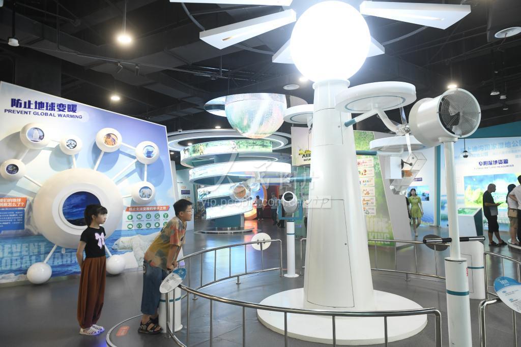 2023年7月9日,安徽省阜阳市两名小学生在本市科技馆展厅内进行模拟“能源塔”科普体验。