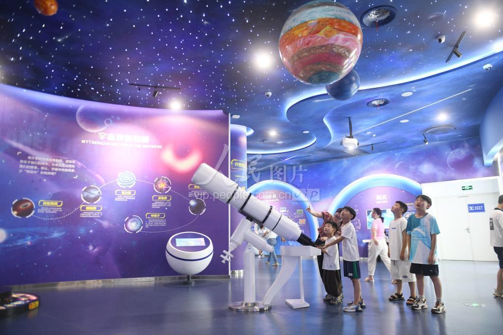 2023年7月9日,安徽省阜阳市几名青少年在本市科技馆内参观体验。