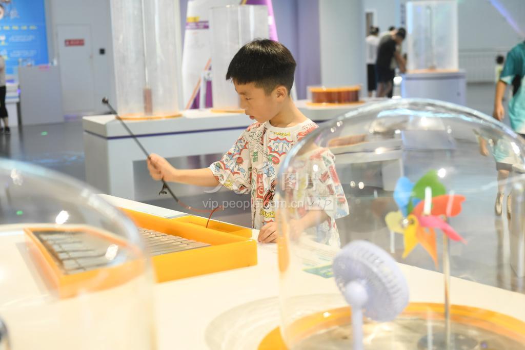 2023年7月9日,小学生在安徽省阜阳市科技馆展厅内参观体验。