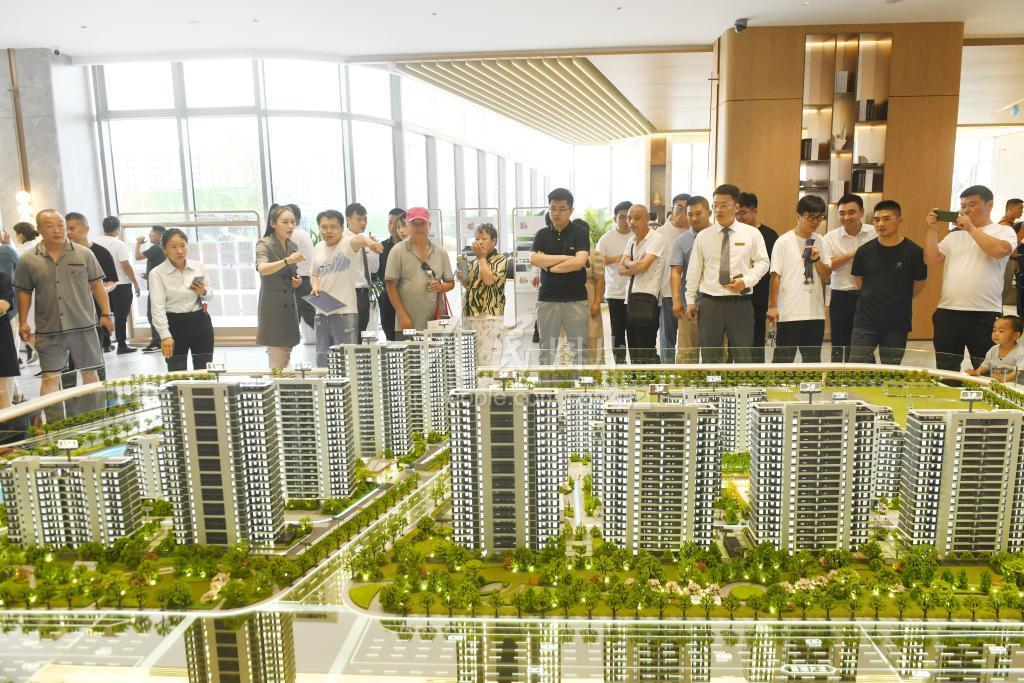 2023年7月15日,安徽省阜阳市一些市民在城区一家房地产营销中心展厅观看楼盘模型。 眼下正值夏季高温季,针对市场刚需和改善性需求,阜阳市不少开发商结合季节特点和市场特点推出了一系列优惠促销政策和活动,吸引不少意向群众前来光顾。