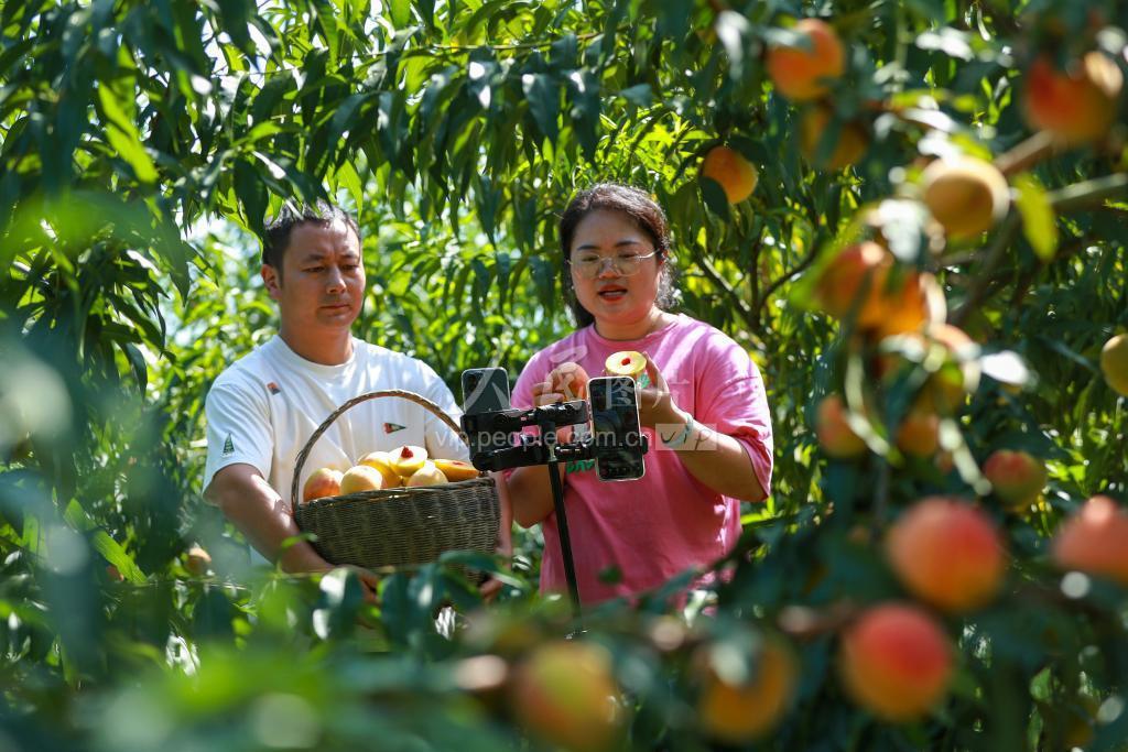 2023年8月22日,秭归县郭家坝镇西坡村回乡新农人陈霞(右)和丈夫王坤在果园带货直播销售锦绣黄桃。