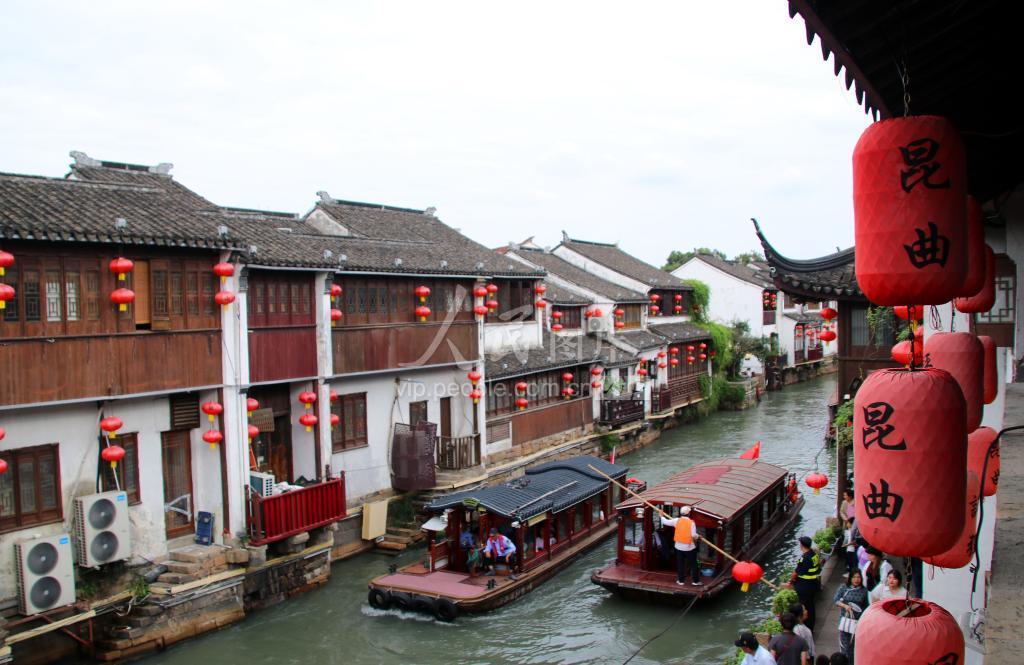 2023年10月5日,众多游客乘船游览江苏省苏州市山塘街水巷。