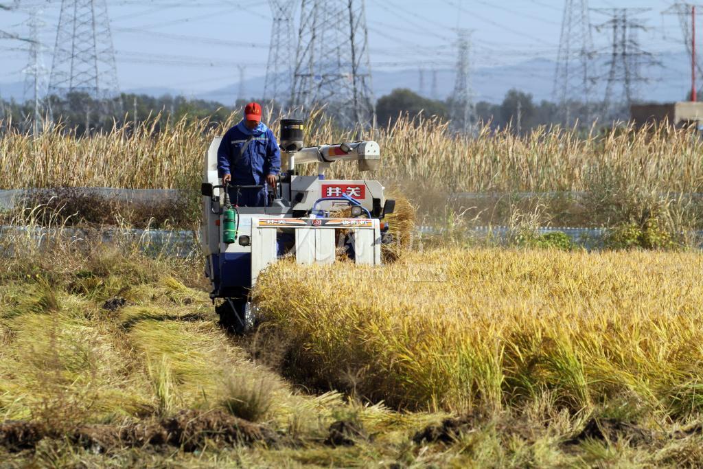 2023年10月5日,辽宁省沈阳市沈北新区兴隆台街道的稻田地,收割机来来往往地忙碌着,一派丰收的喜人景象。