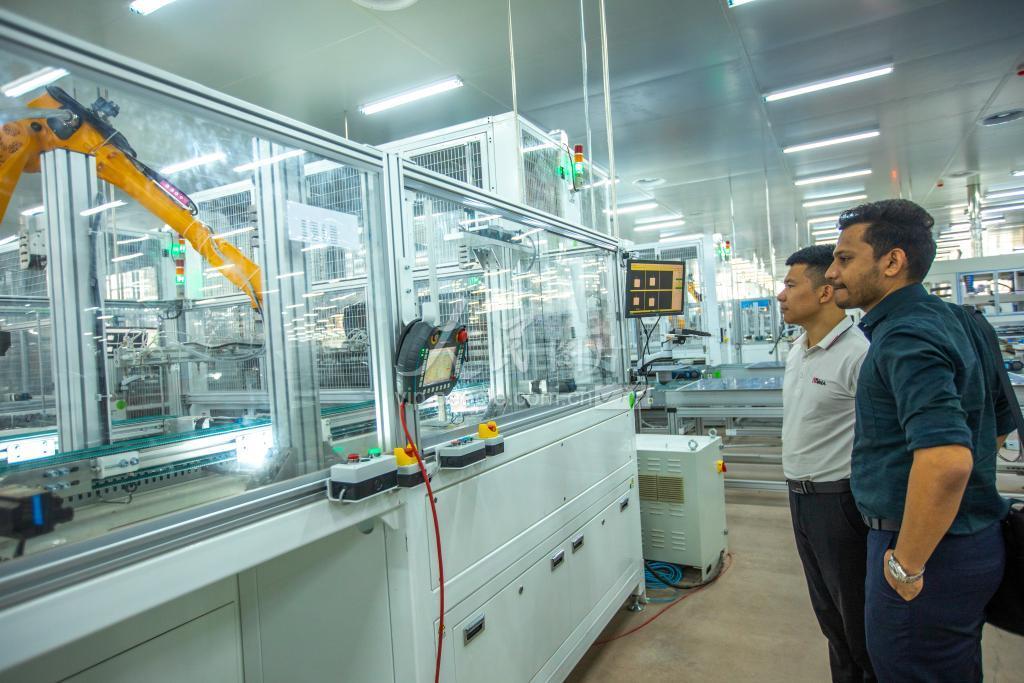 2023年11月3日,浙江金华,金东区江东镇工业园区润马光能集团金华组件厂生产车间内,印度客商正在参观太阳能光伏组件生产流水线。