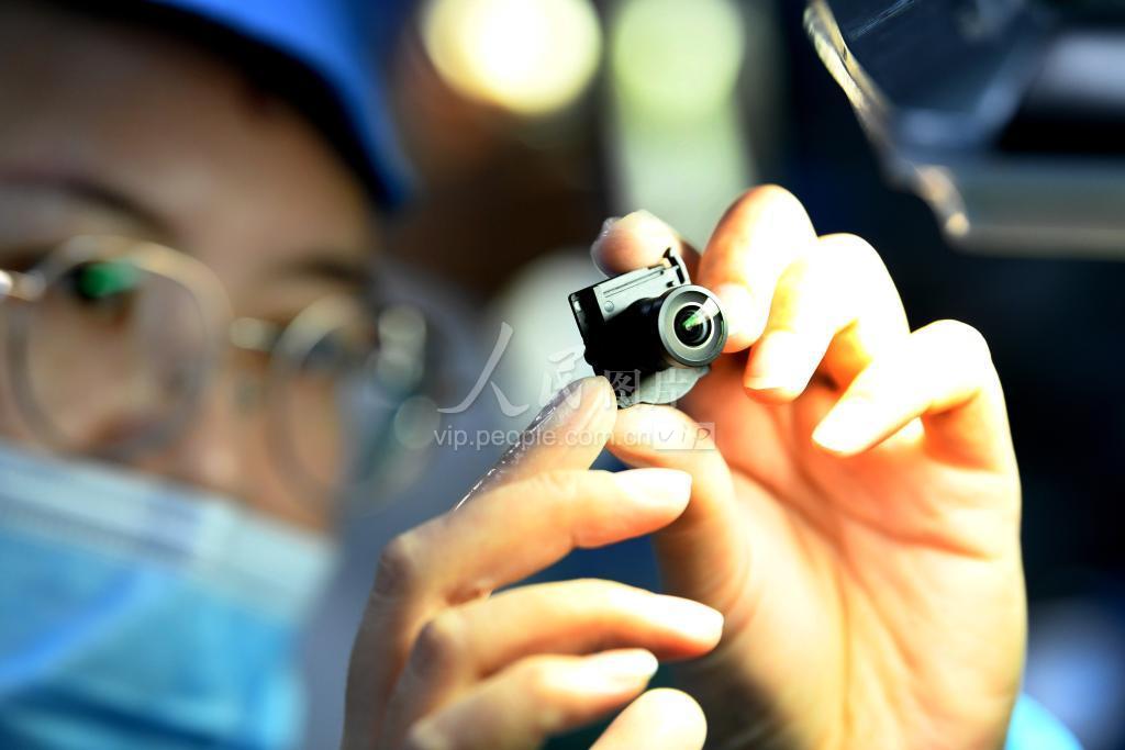2023年11月15日,江西德兴市高新区的光学企业生产车间,员工正在检测顾客订制的直径为16毫米的订单微型镜头。
