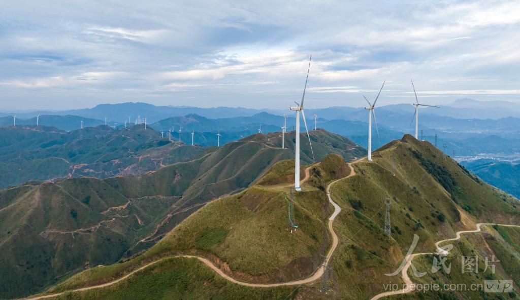 2023年11月19日,在广西南宁市宾阳县武陵镇马王风电场,一排排徐徐转动的风电机组迎风旋转,成为延绵山脉上一道亮丽的风景线。