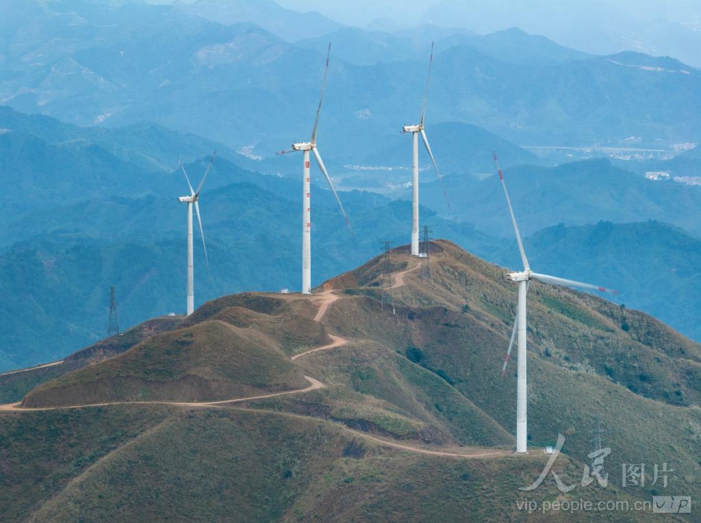 2023年11月19日,在广西南宁市宾阳县武陵镇马王风电场,一排排徐徐转动的风电机组迎风旋转,成为延绵山脉上一道亮丽的风景线。