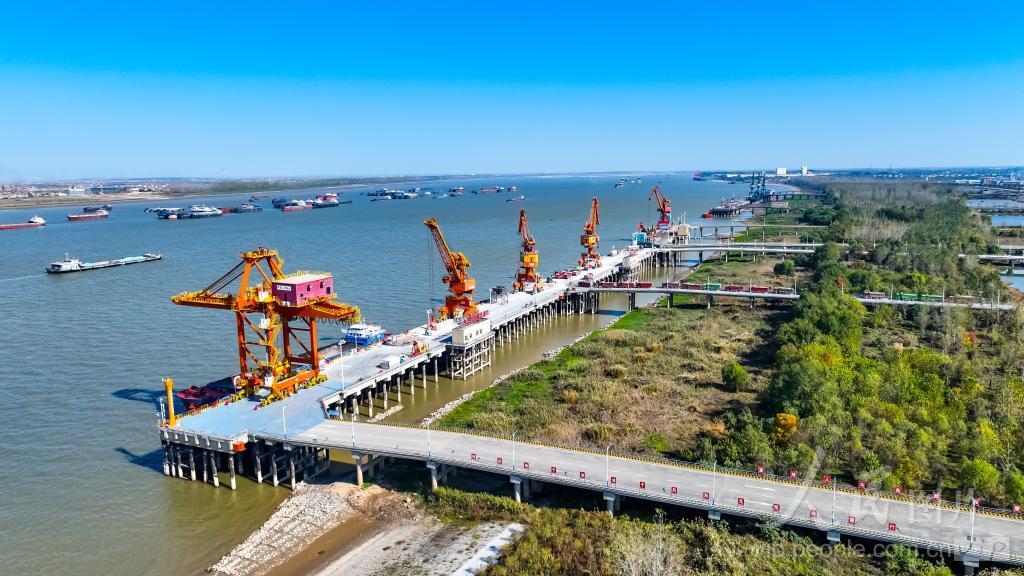 2023年11月24日,江西省瑞昌市码头镇,航拍九江港瑞昌港区,船舶、车辆和岸吊正在进行装卸作业。 江西九江港口岸扩大开放瑞昌港区日前通过国家验收,此次验收,既完善了瑞昌港区的开放功能,也为港区乃至全省及周边外贸货物的直进直出提供了口岸服务,有效扩大九江口岸辐射范围。