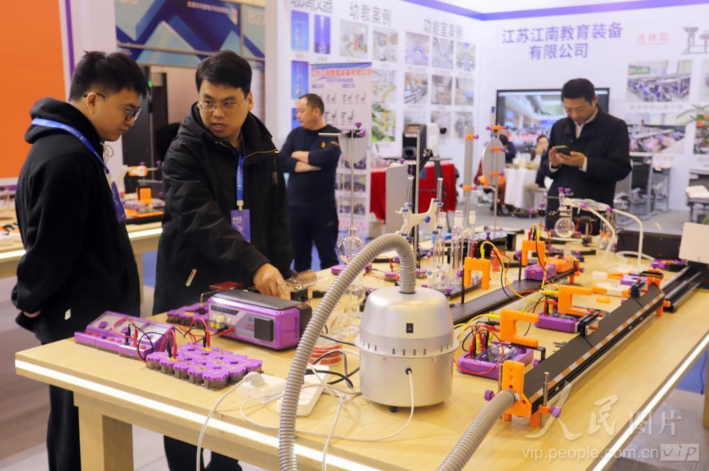 2023年12月15日,观众在首届江苏(苏州)教育装备展上参观理科实验仪器。
