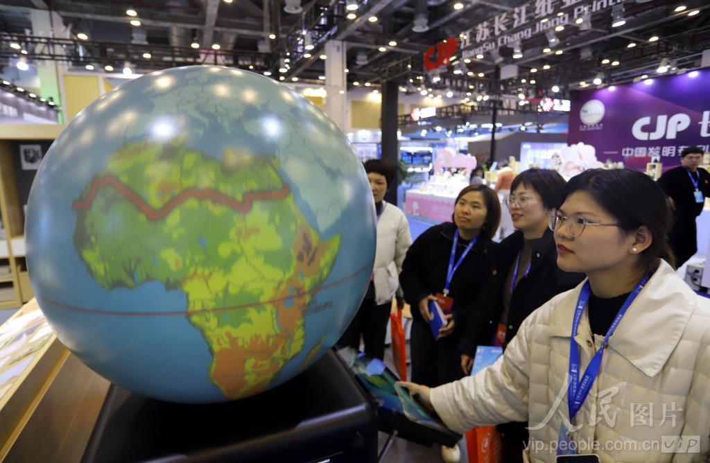 2023年12月15日,观众在首届江苏(苏州)教育装备展上参观智能地球仪。