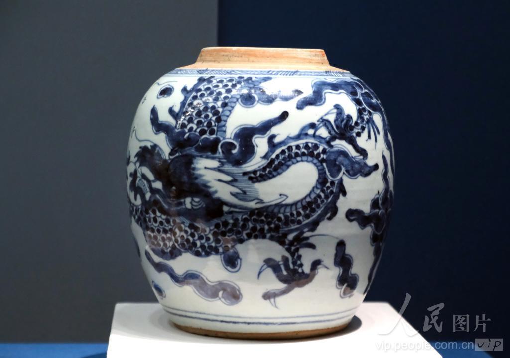 2024年1月20日,在沈阳博物馆展出的清代乾隆青花云龙纹罐。