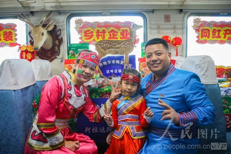 2024年1月25日,黑龙江省齐齐哈尔市,在4045次公益性“慢火车”上,达斡尔族村民在列车上展示当地梅花鹿产品。