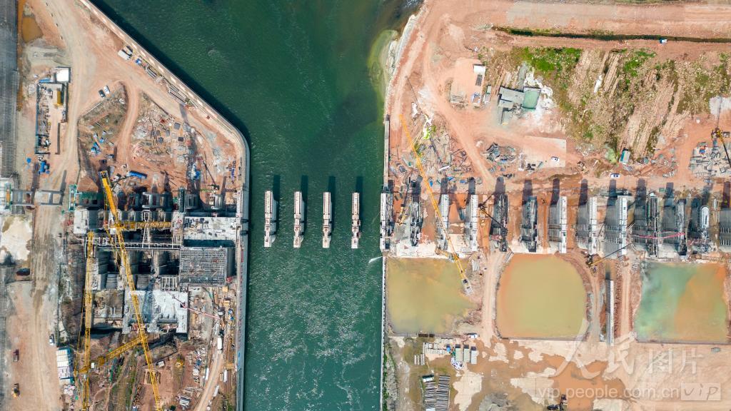 2024年3月13日,在位于四川省眉山市的岷江彭山尖子山航电枢纽工程建设工地现场一派繁忙景象,工人们正抓紧建设。