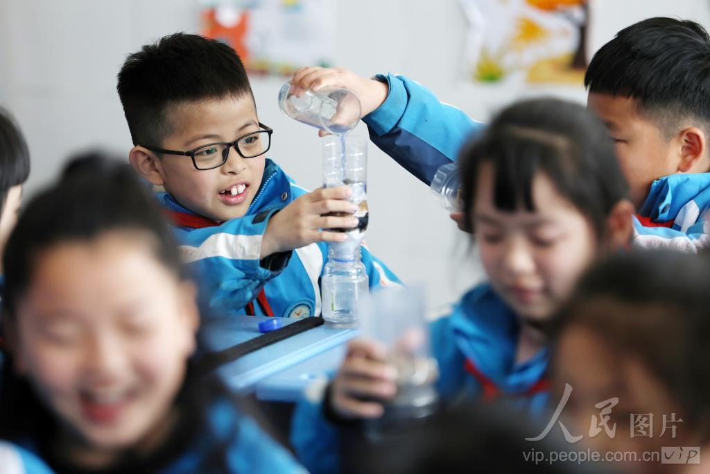 2024年3月21日,山东省郯城县第三实验小学学生正在用自制简易净水器做净水实验。