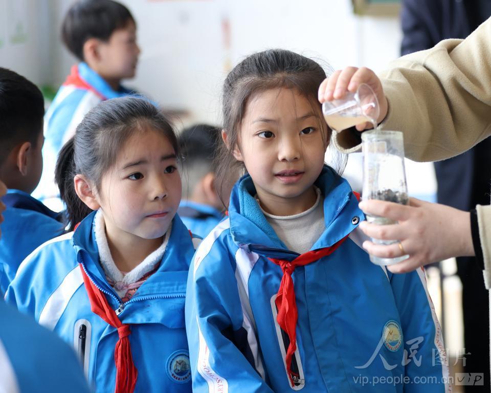 2024年3月21日,山东省郯城县第三实验小学老师正在为学生演示用自制简易净水器做净水实验。