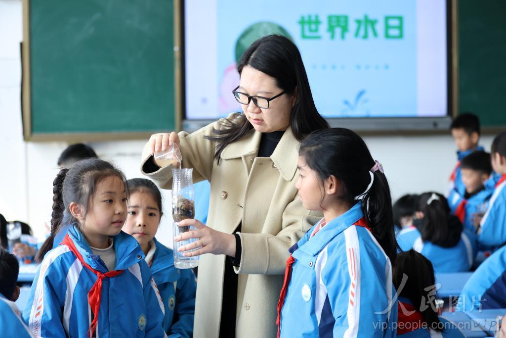 2024年3月21日,山东省郯城县第三实验小学老师正在为学生演示用自制简易净水器做净水实验。