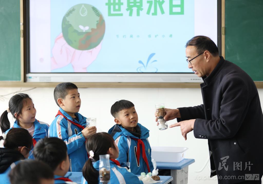 2024年3月21日,山东省郯城县第三实验小学老师正在为学生讲解用自制简易净水器过滤前后的水质变化。