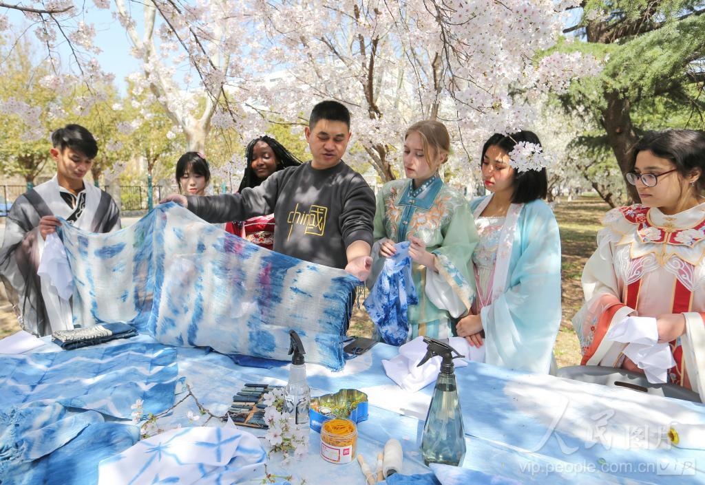 2024年3月31日,江苏海洋大学老师正在给留学生讲解蓝染技法。