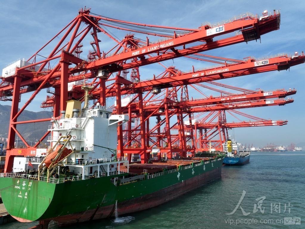 2024年4月12日,在江苏连云港港集装箱码头,货轮停在泊位上装卸集装箱。