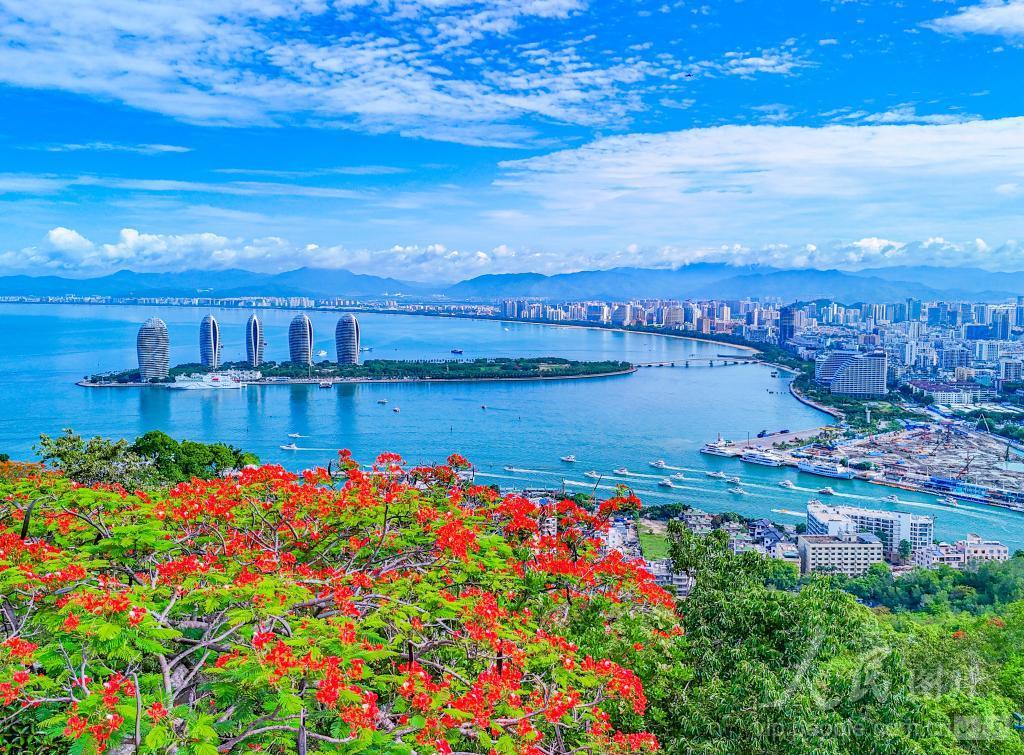 2024年6月2日,从三亚市鹿回头风景区远眺三亚湾,碧海如染,蓝天白云辉映,呈现一派蓬勃的夏日画卷。
