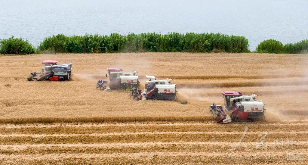2024年6月4日,江苏省宿迁市泗洪县瑶沟乡农机服务队正在帮助桂湾村种植大户抢收小麦。