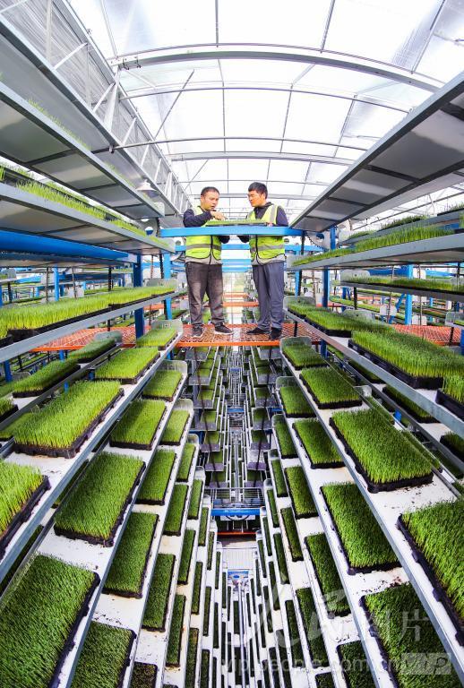 2024年6月14日,江苏省连云港市海州区5G智慧农场育秧室内,立体式育苗床培育的备用水稻秧苗长势喜人。 据悉,该系统根据环境参数,对温室的天窗、风机湿帘等设备进行综合调控,实现秧盘接收的光、热、水均匀、适度,提高秧苗标准化程度。