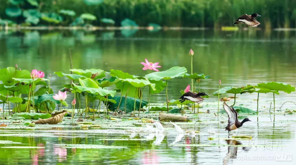 2024年6月15日,江西省瑞昌市东郊,几只青头潜鸭在水面上游弋嬉戏。青头潜鸭素有“鸟中大熊猫”之称,是国家一级保护动物。 近年来,瑞昌市积极开展生态环境治理,通过沿湖岸线整治、水质生态修复等举措,优化、美化生态环境,为青头潜鸭等候鸟营造了更加宜居的美好家园。